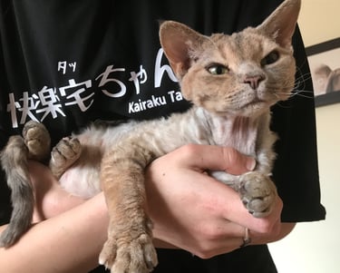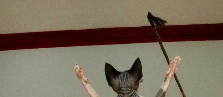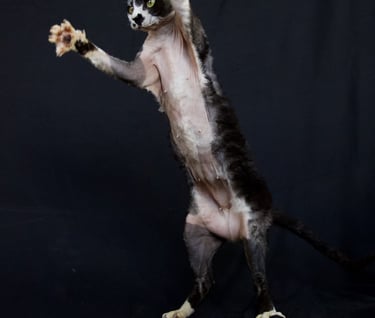 Beetle was a precocious kitten right from the start, totally bald at birth but gobby and demanding, I think I had decided to keep her when she was less than 2 days old. She is the most on the go cat I have owned and she is very entertaining to play with. Beetle has produced some beautiful kittens and was a great mum, she has now been spayed. I am please to say that since she was spayed she has grown a half decent coat :)